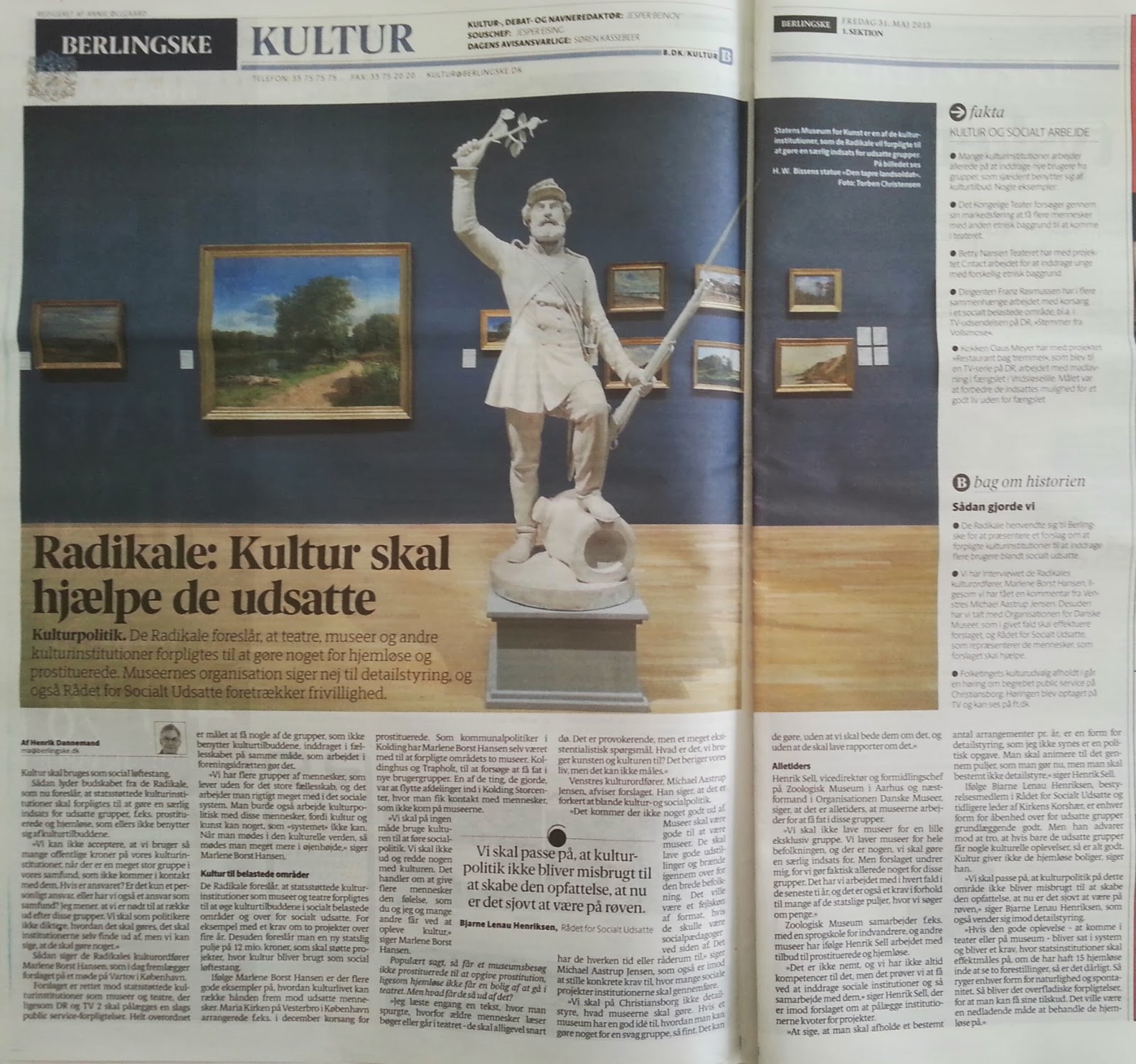 Så derfor synes jeg vi skal være opmærksomme på den politiske debat, som altså udtrykkes i berlingske i dag om, at kultur skal bruges som social løftestang, hvilket vel er hovedbudskabet fra de Radikale, som foreslår, at statsstøttede kulturinstitutioner skal forpligtes til at gøre en særlig indsats for udsatte grupper, f.eks. prostituerede og hjemløse, som ellers ikke benytter sig af kulturtilbuddene. Og en ny statslig pulje på 12 mio. kroner.