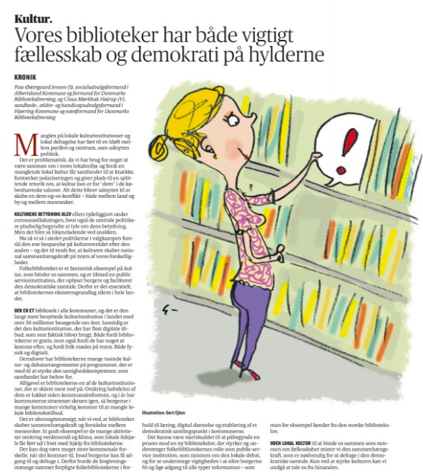 Sådan lød det i denne uge i en KRONIK i Avisen Danmark af Paw Østergaard Jensen (S), socialudvalgsformand i Albertslund Kommune og formand for Danmarks Biblioteksforening, og Claus Mørkbak Højrup (V), sundheds-, ældre- og handicapudvalgsformand i Hjørring Kommune og næstformand for Danmarks Biblioteksforening